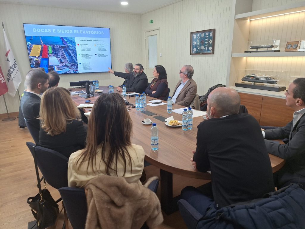 Em muito interessante apresentação foi mostrada a atividade da Empresa ao longo dos últimos 12 anos, período de crescimento sustentável, que se deseja balanceada entre a construção e a reparação naval. Igualmente foi abordado o investimento que está a ser realizado, nomeadamente a construção de uma terceira doca seca que aumentará a capacidade de reparação e permitirá receber navios de maior dimensão – 220 m de comprimento e 45m de largura.